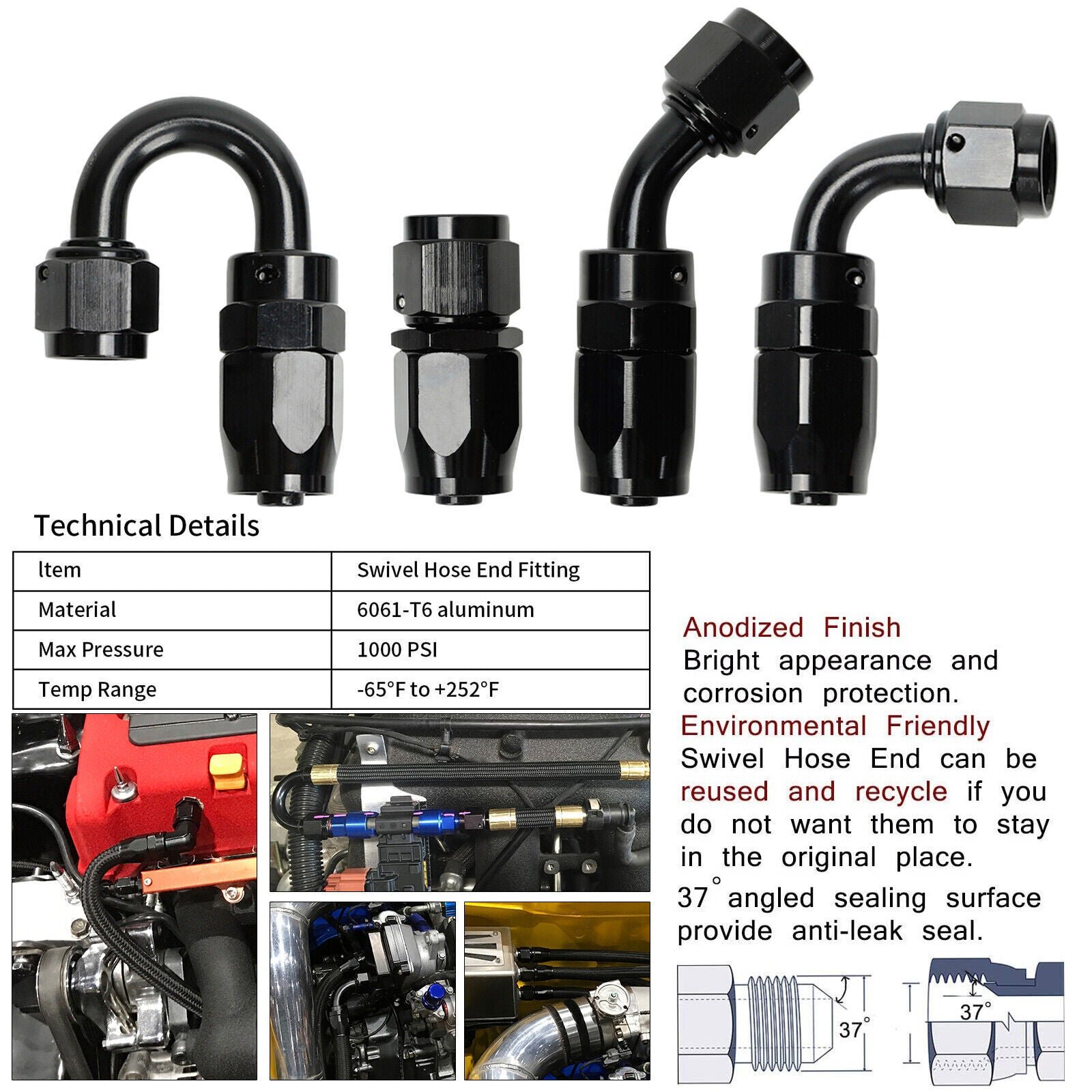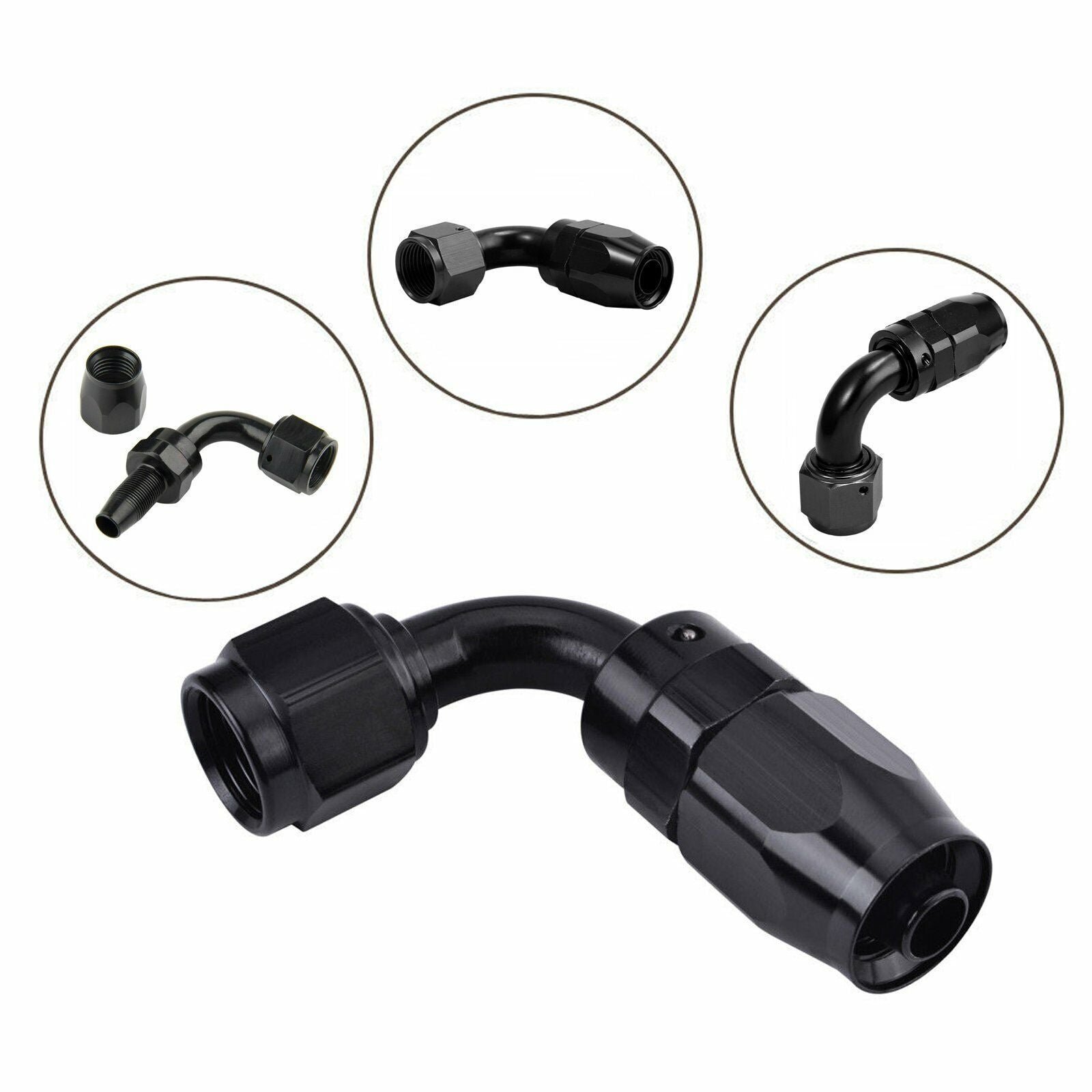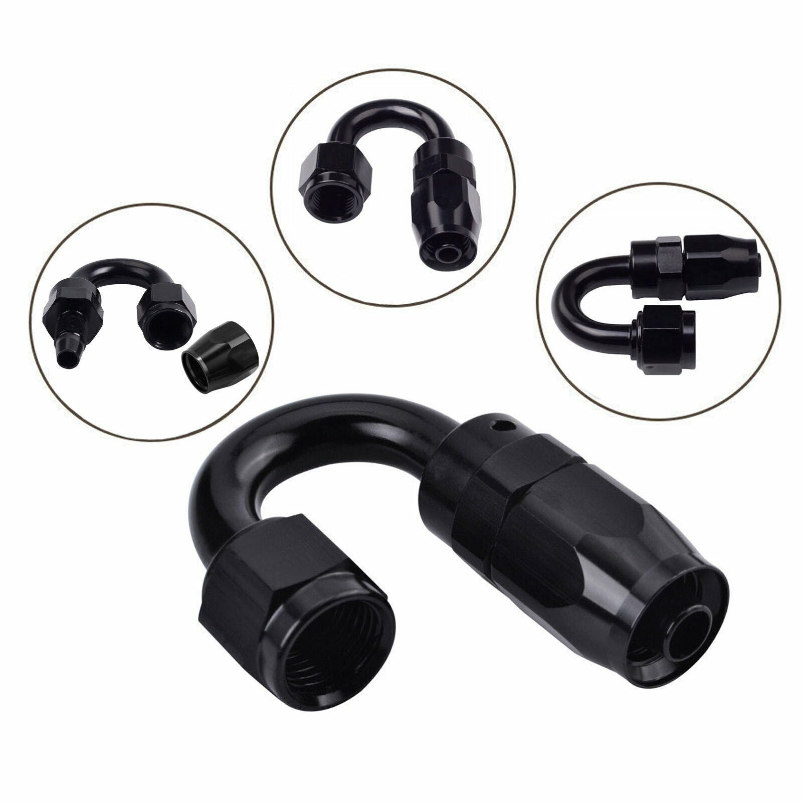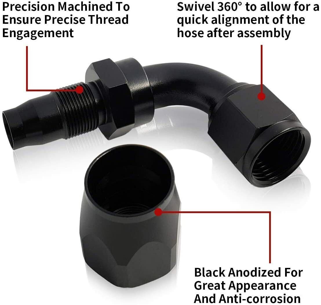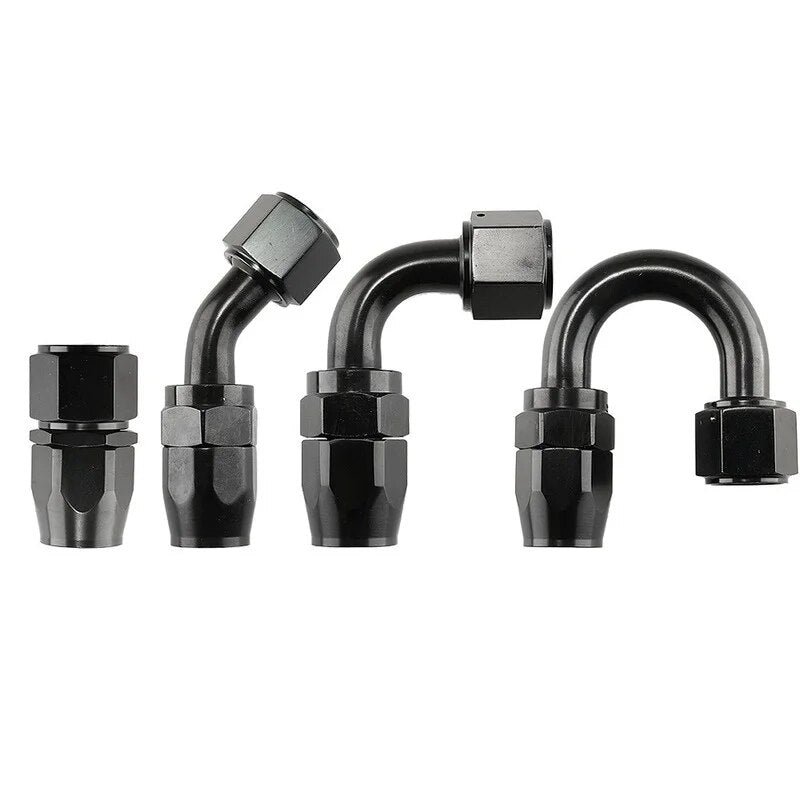 The female 4AN/6AN/8AN/10AN/12AN swivel fittings are made of lightweight aluminum alloy 6061-T6 material for strong strength and good durability. Black anodized for great appearance and anti-corrosion. superior thread strength. Max Working Pressure: 1000psi. Working Temperature Range: -65℉ to 252℉ (-53℃ to 122℃). Can be suitable for competition applications where reduced weight is needed.