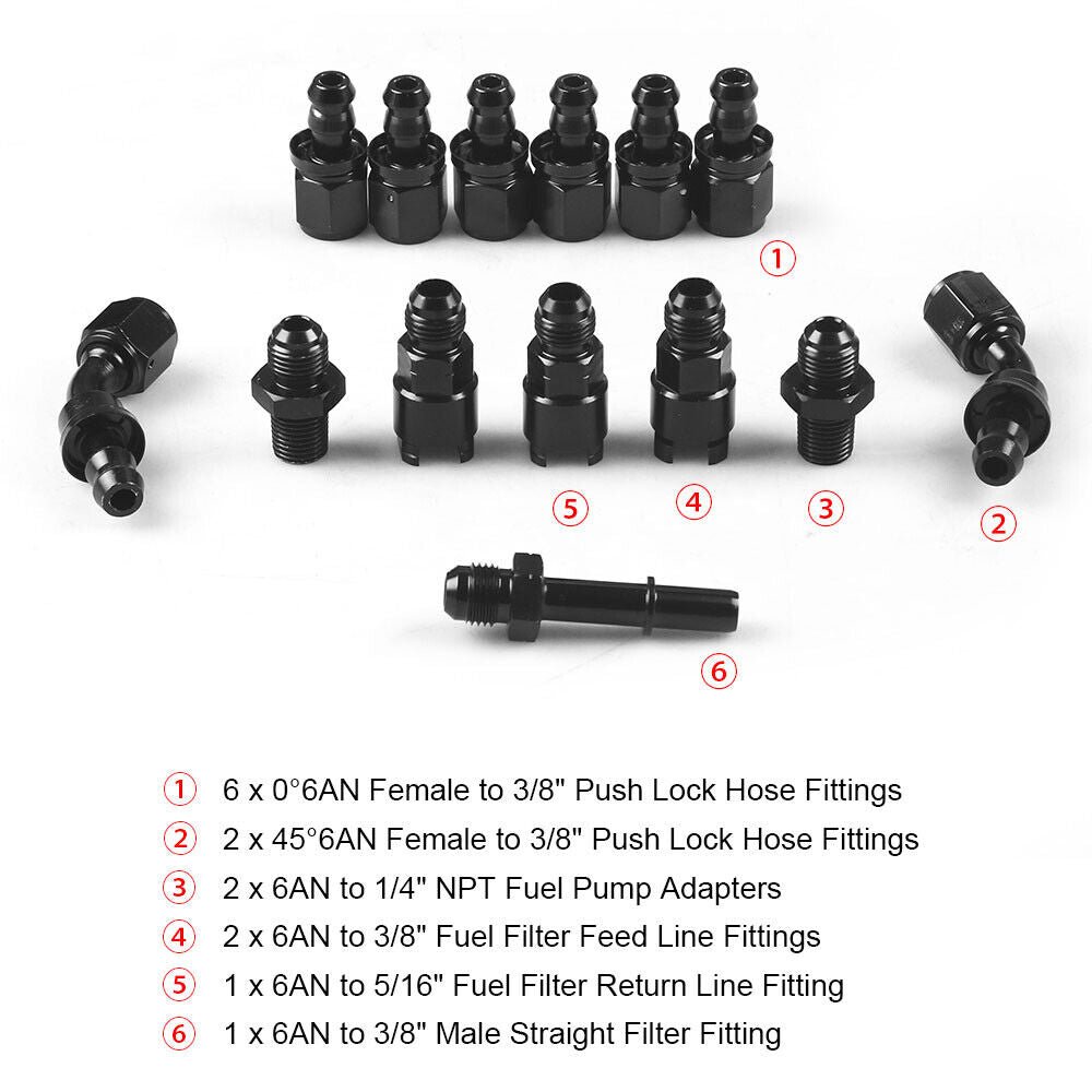 This complete LS conversion fuel line kit comes with 25-feet of properly rated fuel injection hose and all the correct fittings to plumb your fuel lines from the fuel pump forward. All the fittings feature a reusable spin-lock connector that does not require special tools to disassemble.Professional Installation Is Highly Recommended. No Instruction Included.